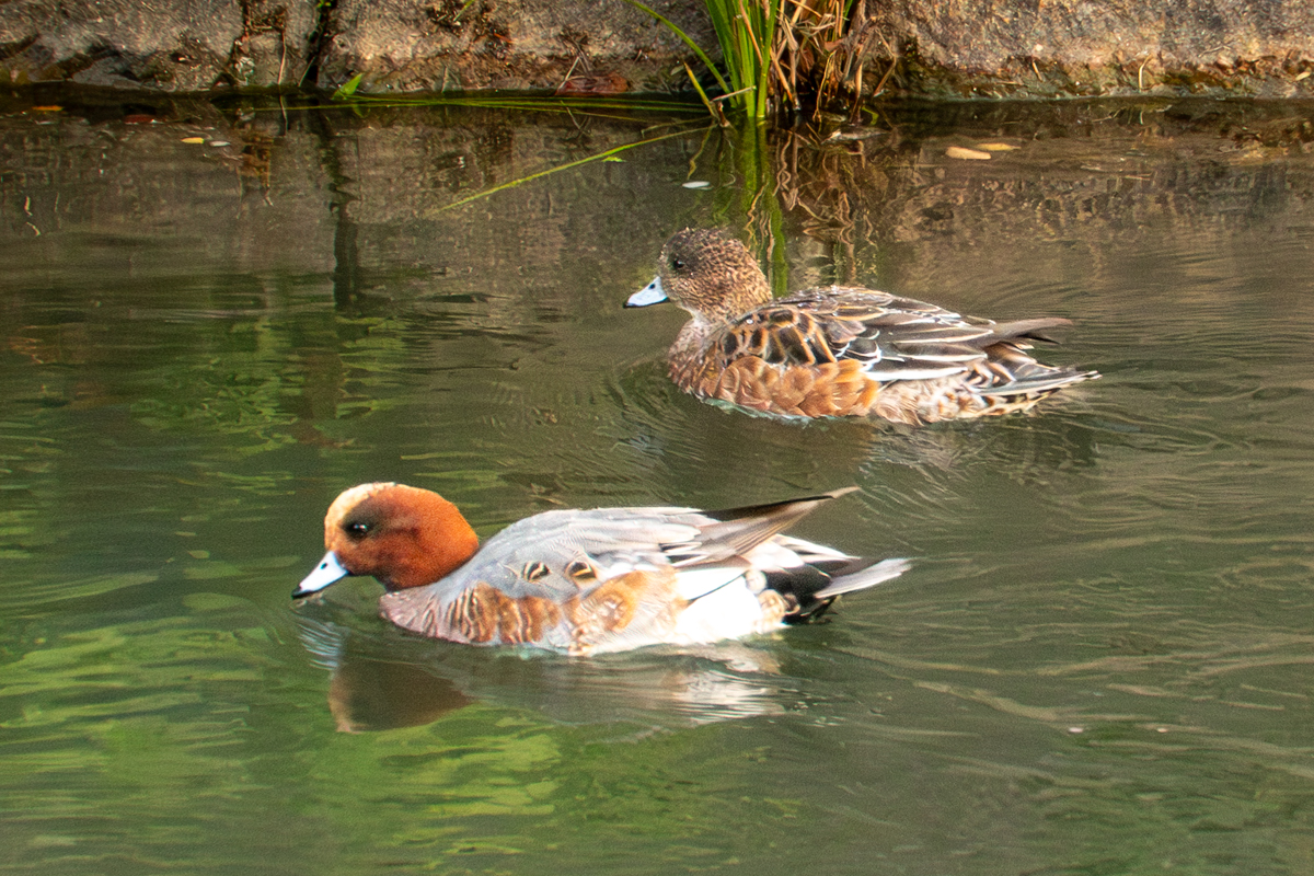 (6)岡崎疎水にヒドリガモがいた。左が♀,右が♂。