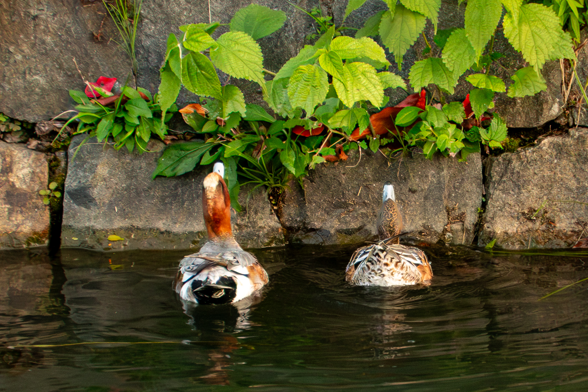 ・ヒドリガモのつがい。地味な方が♀。〔疏水〕[写真3]