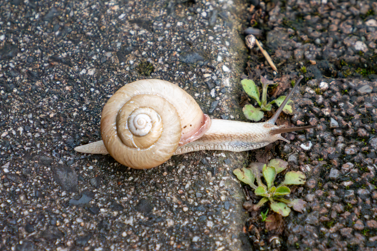 クチベニマイマイが,道の真ん中をゆっくりと横切っていました。