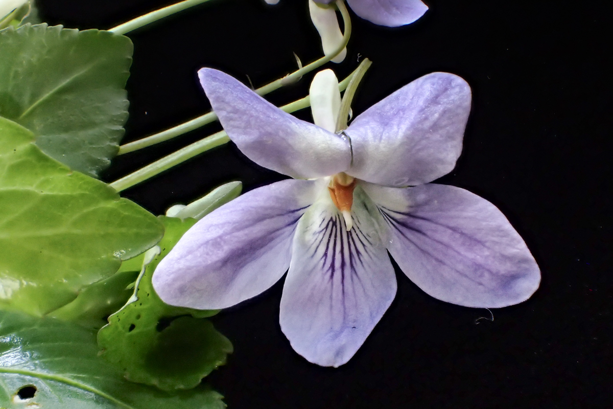 スミレの花。日本産のスミレは約100種類あるとか。これはタチツボスミレ。花びらは薄い紫色です。